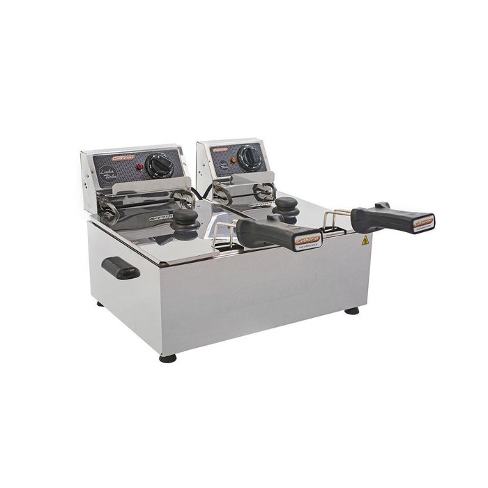 A Fritadeira Elétrica Turbo é ideal para pequenos e grandes empreendedores de bares, padarias, restaurantes, cafeterias, buffets, lanchonetes, lojas de conveniência e de cozinhas em geral. Com uma capacidade total de 8 litros, ela é uma fritadeira perfeita para preparar porções na medida certa para seus clientes ou convidados. Para uma maior segurança, vem equipada com alças laterais em material termo isolante, termostato regulável, cestos mais robusto produzido em arame estanhado e cuba em aço inox, removível, para uma maior facilidade na limpeza. Possui caixa de ligação em aço inox. Contém um sensor de temperatura (bulbo) em contato direto com o óleo, o que proporciona maior confiabilidade na leitura da temperatura. O Sistema de segurança atua protegendo o superaquecimento do óleo e do elemento resistivo, proporcionando sua retomada com o simples rearme manual. 2 cuba de armazenamento em aço inoxidável com capacidade para 3 e 5 litros de óleo, respectivamente, e cesto robusto em aramado de fácil remoção trazendo praticidade, principalmente na hora de limpar. O Prático sistema de escorredor faz com que o excesso de óleo retorne a cuba de armazenamento, garantindo frituras sequinhas e mais saudáveis. Não perca a oportunidade de adquirir! Potência desenvolvida para maior rapidez e qualidade de fritura. Cuba em aço inox com marcação de nível máximo e mínimo. Cesto em arame estanhado e alça em material termo isolante. Cesto, resistência e cubas removíveis para fácil limpeza. Caixa de ligação em aço inox. Termostato com regulagem de 50ºC a 210ºC. Termostato de segurança contra superaquecimento. Pés antiderrapantes. Plug 3 pinos ( Conforme padrão brasileiro )