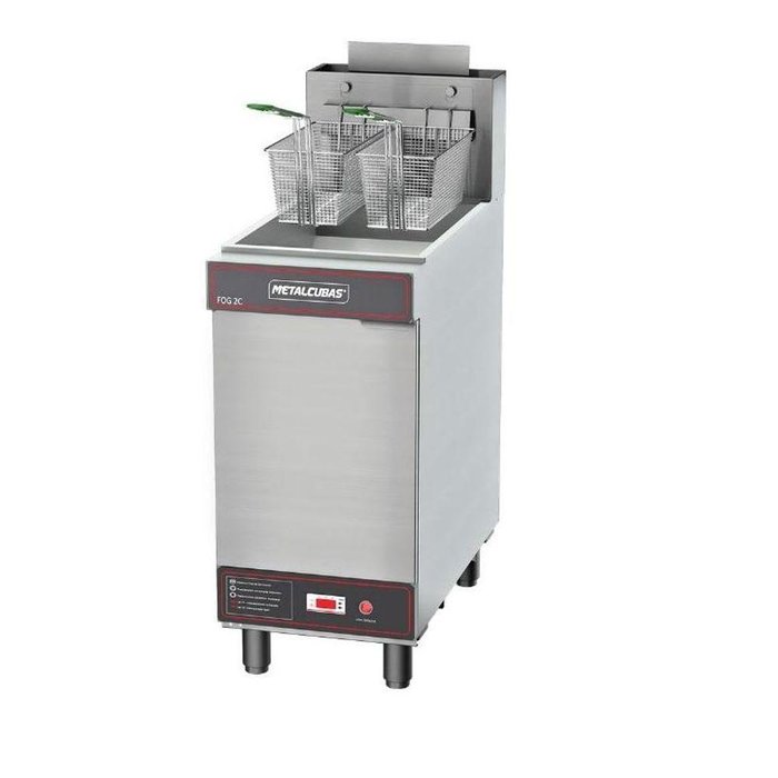 Fritadeira Industrial A Gás Fog-2c Metalcubas 30l. óleo 2 Cestos A fritadeira Metalcubas é uma união de tecnologia, eficiência e robustez. Para frituras saborosas e sequinhas. Perfeita para alimentos preparados através de imersão em óleo, nas quais utiliza o próprio óleo como filtro, garantindo assim uma durabilidade maior na vida útil do óleo. Disponíveis em 127V ou 220V Bivolt. Especificações do Produto: Equipamento para Gás em Baixa Pressão.Cestos robustos com cabo isolado. Controlador de temperatura digital garante a precisão na informação e segurança. Termostato de segurança e acendimento automático. Monitoramento conta falta de gás nos queimadores. Queimadores em Alumínio Fundido de alta potência que proporcionam rápida recuperação de temperatura, essencial para frituras com qualidade. Tanque em aço inoxidável 304 para facilitar a limpeza diária. Difres de calor em aço inox 304, garantem um melhor aproveitamento do calor gerado pelos queimadores. Dados Técnicos: Capacidade Nominal Óleo (Litros): 30 Capacidade por fritura (Kg): até 2 Queimadores: 3 Potência (BTU/H): 90.000 Medidas em Centímetros: Altura: 109 Largura: 39 Profundidade: 80 Peso Líquido (Kg): 50 Área de fritura: 35 x 38 Consumo Gás GLP (Kg/h): 1,85 Tensão (Voltagem): 127 ou 220V Bivolt.Disponivél também na versão GN (Gás ). IMPORTANTE: Lembre-se de que alimentos congelados ou com resíduos de gelo em contato com o óleo quente podem cautilizar queimaduras se for manipulado de forma incorreta.NA