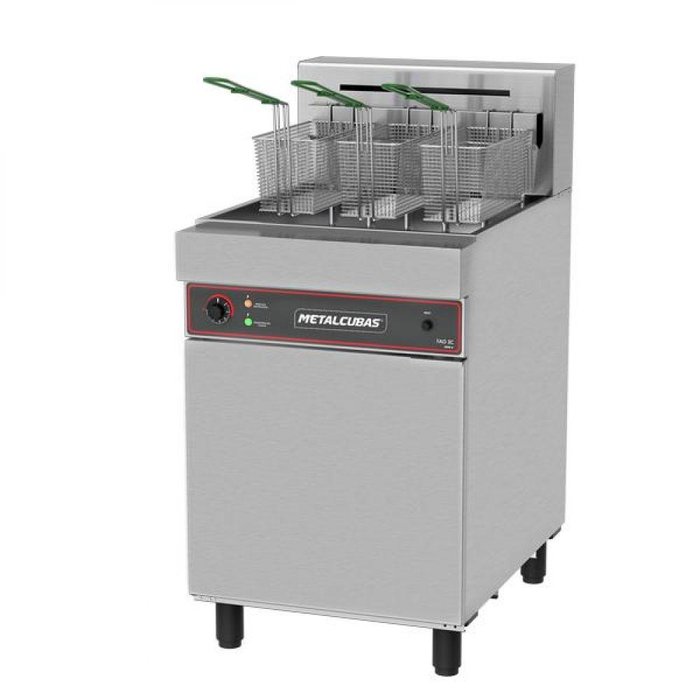 Fritadeira Industrial Elétrica Fao-3c Metalcubas 38l Óleo / 6l Água 3 Cestos 18000watts - 380vPara frituras saborosas e sequinhas.Perfeita para alimentos preparados através de imersão em óleo, nas quais utiliza água como filtro, garantindo assim uma durabilidade maior na vida útil do óleo.Com resistências de alta potência que proporcionam rápida recuperação de temperatura, essencial para frituras com qualidade.Cestos robustos com cabo isolado e tanque em aço inox 304 para facilitar a limpeza diária.Dois termostatos, um de controle e outro de segurança.Todos os produtos são fabricados com materiais de alta qualidade e acabamento superior, dentro das normas de segurança e higiene das leis vigentes.OBS.: Dissolver sal grosso na água em uma vasilha nas quantidades indicadas nas especificações técnicas, colocando após, a solução obtida dentro do reservatório.Disponíveis apenas em 220V e 380V trifásico.Dados Técnicos:Capacidade Nominal Óleo (Litros): 38Capacidade Nominal Água (litros): 6Sal grosso (Kg): 0,5Capacidade por fritura (Kg): até 3Potência 220/380 v (K/w): 18,0Medidas em Centímetros:Altura: 111Largura: 56Profundidade: 77Peso Líquido (Kg): 44Área de fritura: 52 x 38Consumo (Kw/h): 12,6Tensão (Voltagem): Trifásico 220 / 380VIMPORTANTE:Use apenas gordura ou óleo VEGETAL.Marca :METALCUBAS