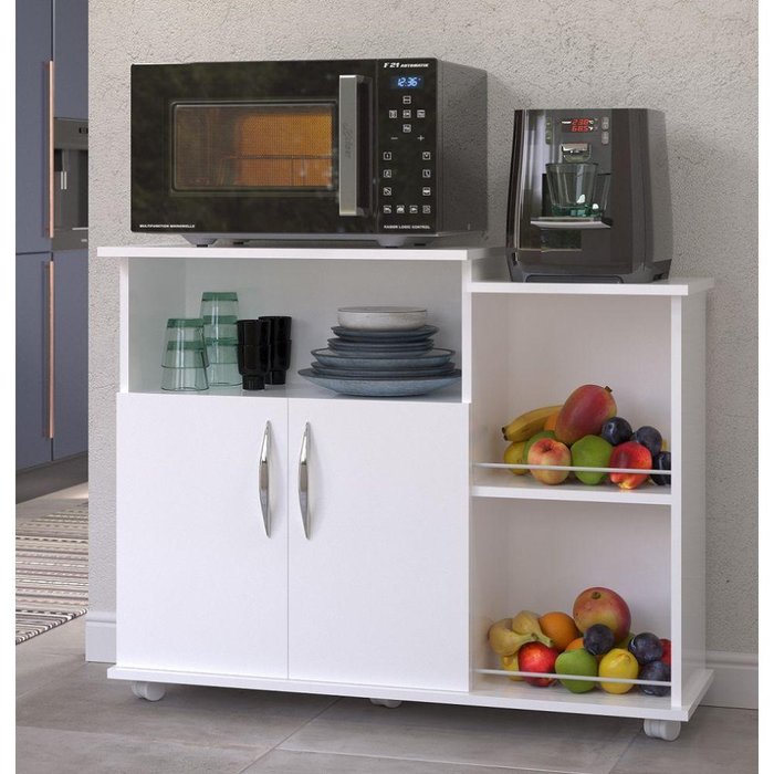 FRUTEIRA ARMÁRIO BALCÃO P/ BEBEDOURO E MICROONDAS Para você que procura um móvel que ocupa pouco espaço e que ofereça beleza e praticidade a Click Forte desenvolveu esse lindo armário, ideal para te ajudar na organização da sua cozinha, dispensa, lavanderia, com 02 portas, 01 Nicho para utensílios domésticos e tem 02 espaços suficientes para armazenarem frutas, legumes etc., além de Rodinhas para facilitar sua locomoção na hora da limpeza do dia a dia. MEDIDAS: Altura: 72cm Largura: 92cm Profundidade: 34cm - 2 Portas - 2 Espaços para Frutas - Cor: Branco - Rodízios - Rodinhas Brancas - Acabamento alto brilho - Material: Madeira MDP - Puxadores PVC Cromado - Comporta Micro-ondas e Bebedouro