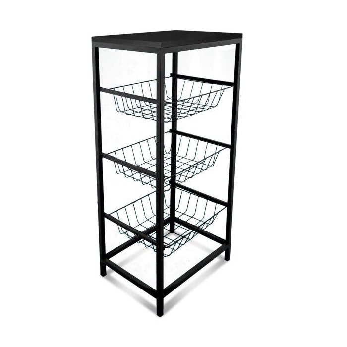 Fruteira Cozinha de Chão Aço com Tampo Mdf 3 Cestos Preta Preto