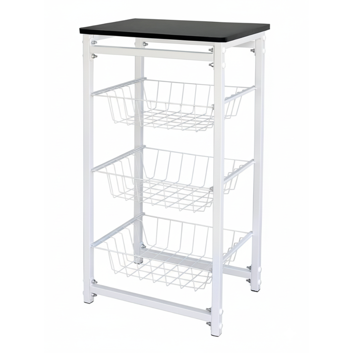 Fruteira de Chão 3 Cestos para Cozinha Tampo Madeira Mdf Modelo Florença Suporte em Aço Branco Preto
