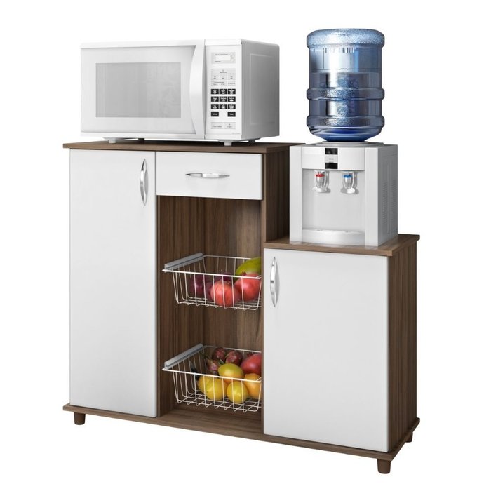 Equipada com cestos aramados, gaveta com corrediça metálica e prateleira interna, o modelo conta ainda com tampo superior resistente, ideal para acomodar micro-ondas ou bebedouros. O acabamento em pintura ultravioleta com brilho garante durabilidade e um visual moderno.