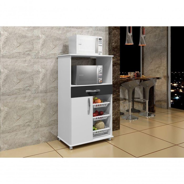 Veja que produto versátil, prático e funcional, além de belíssimo! Esta fruteira com balcão vai agregar mais requinte a sua cozinha com dois tampos super resistentes, que pode acomodar forno elétrico e microondas, possuindo ainda uma ampla gaveta com corrediça metálica, uma prateleira interna removível e fruteiras em plástico. Sua cozinha precisa de um móvel deste, não perca tempo peça já a sua!