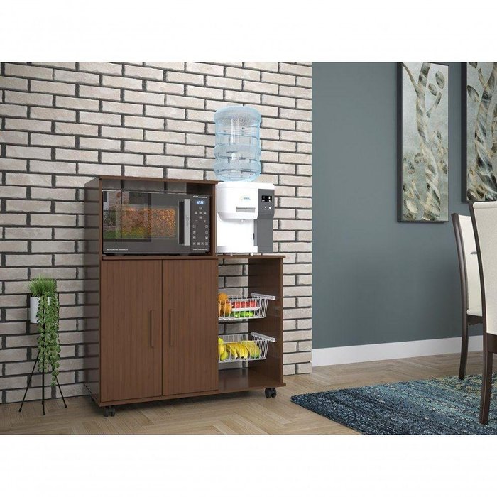 2 Portas Amplo espaço para Microondas, cestos para frutas em aço, rodízios 50mm para facilitar a movimentação do móvel e puxadores em madeira