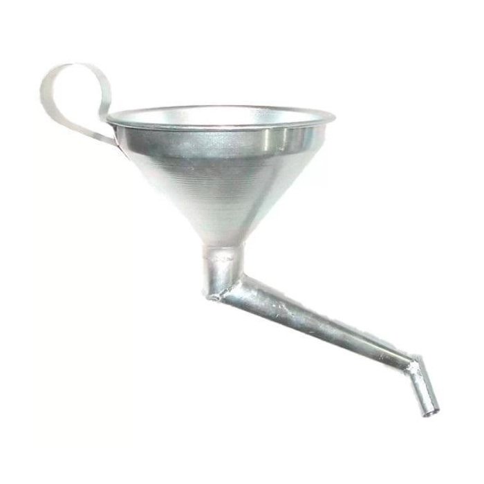 Funil produzido com chapa de aço carbono, com alça soldada a ponto sem rebarba e tratamento de galvanoplastia, que é o banho estético que ajuda prevenir pequenas oxidações no funil para óleo lubrificante.