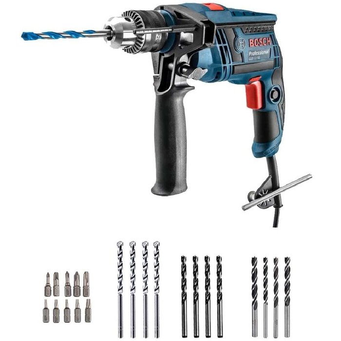 Fabricante ?Robert Bosch LtdaNúmero da Peça ?060123D5E3-000Cor ?AzulTipo de fonte de energia ?Elétrico com fioVoltagem ?220 VoltsPotência em watts ?650Potência máxima ?650 WattQuantidade por pacote ?1Número de produtos ?1Velocidade ?2800 RPMComponentes inclusos ?1 Furadeira de Impacto GSB 13 RE, 1 manual de instruções, 1 Chave de mandril, 1 Empunhadeira auxiliar, 23 acc (4 brocas concreto, 4 brocas madeira, 4 brocas metal, 10 bits, 1 extensor)Baterias inclusas? ?NãoFunciona a bateria ou pilha? ?NãoPeso ?2.5 QuilogramasComprimento ?27.4 centímetrosLargura ?7 centímetrosAltura ?21 centímetrosFabricante ?Robert Bosch LtdaModelo ?060123D5E3-000Número do modelo ?060123D5E3-000Dimensões do produto ?27.4 x 7 x 21 cm; 2.5 QuilogramasASIN ?B076YFS9QZMarca ?BoschEAN ?7891009836041