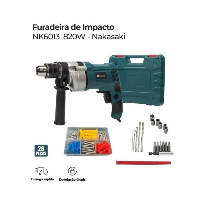 MAQUINA de ALTA QUALIDADE TECNOLOGIA JAPONESA.VALORIZE SEU DINHEIRO, COMPRE ESSE EQUIPAMENTO de QUALIDADE, COM PREÇO DENTRO DA REALIDADE..GARANTIAATENDIMENTO 24H- Alta precisão na broca- Potente motor com 820w- Punho com design ergonômico, mais Conforto para seu dia a dia.- Velocidade Variável- Auto Reverso- Maquina rolamentada- Frente em açoEspecificações:- Marca: Nakasaki- Modelo: NK6030- Tensão: 110V - Potência : 900w- Mandril : 13mm- Impactos por min.: 0-48.000- Rotações por min.: 0 - 3200RPM- Capacidades: Concreto-16mmAço-13mmMadeira-30mm- Dimensões (C x L x A): 31x29x9cm- Cabo de Energia : 2mACOMPANHA:- 1 PUNHO- 1 REGUA de PROFUNDIDADE- 1 CHAVE de MANDRIL- 8 CACHIMBOS- 2 PONTAS FENDA- 2 PONTAS PHILIPS- 1 PONTA UNIVERSAL- 1 EXTENSOR PARA FURADEIRA- 2 BROCA de CONCRETO- 2 BROCA de MADEIRA- 5 BROCA de AÇO CARBONO- MANUAL- MALETA de QUALIDADE