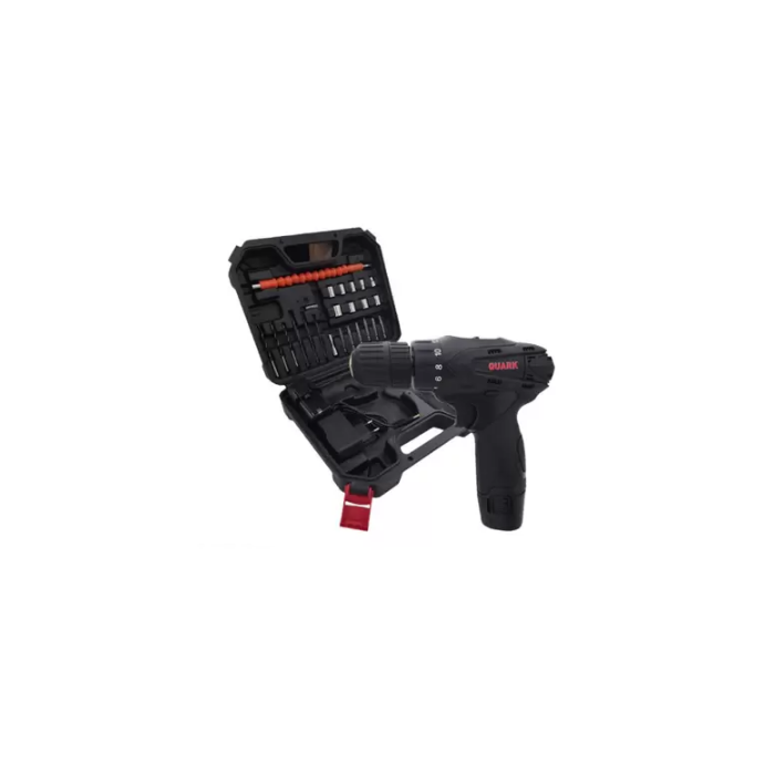 Furadeira/Parafusadeira à Bateria 12V 1,3A DCL13 Quark Função reverso, controle de velocidade, mandril de aperto rápido, empunhadura emborrachada, 10 posições de torque + 1 perfuração, acompanha bateria extra e mais 24 acessórios. Tensão da bateria: 12v. Corrente: 1,3A. Tempo de carga: 3 horas. Carregador:110v/220v. 60hz (bivolt). Capacidade do mandril: 10mm. Posiçao do torque: 18. Velocidade: 350 - 1350 rpm. Marca: Quark
