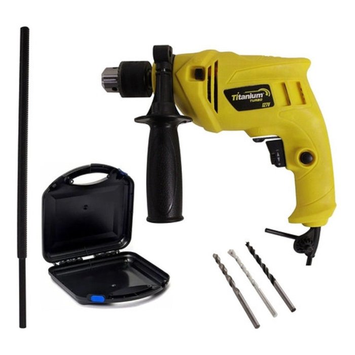 CARACTERÍSTICAS Furadeira parafusadeira de impacto Titanium Turbo ESPECIFICAÇÕES - Capacidade do Mandril: 13mm - Tipo do mandril: com chave - Torque: 10 Nm - Rotação: 3100rpm - Potência: 500w - Capacidade de furação: Aço: 10mm / Madeira 25mm / Concreto: 13mm ITENS QUE ACOMPANHAM - 1 Broca aço rápido 4mm - 1 Broca para madeira 4mm - 1 Broca wídea 4mm - Empunhadeira - Limitador de profundidade + Maleta Plástica Média Preta Para Furadeira 4003 Polymer CARACTERÍSTICAS: - Seja para o profissional ou para o uso doméstico, as ferramentas são fundamentais e para terem vida longa, alguns cuidados são necessários, como guardá-los em local adequado. - A maleta de plástico media é indicada para organizar e transportar ferramentas, peças e acessórios em geral. ESPECIFICAÇÕES: - Material: Plástico - Ideal para furadeira - Possui trava - Dimensões: 310 x 313 x 79 mm