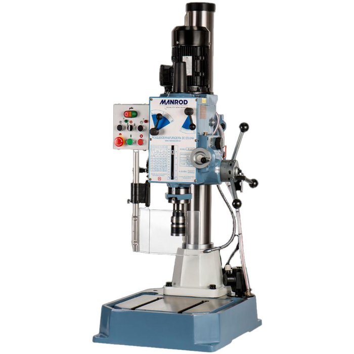 Furadeira Rosqueadeira de Bancada Engrenada, Capac. Ø 32/40mm, Rosquear M24 / M32, (220V-TRIF) O QUE É A FURADEIRA ROSQUEADEIRAA furadeira rosqueadeira é uma ferramenta elétrica projetada para realizar tanto operações de furar como de rosquear. Ela combina as funcionalidades de uma furadeira e de uma máquina de rosquear em uma única unidade. Essa ferramenta é especialmente útil em trabalhos onde é necessário realizar furos e inserir roscas em metal, madeira ou outros materiais. A furadeira rosqueadeira facilita o processo, pois elimina a necessidade de trocar entre uma furadeira e uma máquina de rosquear, oferecendo maior eficiência e conveniência em várias aplicações, como montagem de móveis, construção metálica e outras atividades relacionadas. COMO UTILIZAR A FURADEIRA ROSQUEADEIRAA furadeira rosqueadeira é uma ferramenta versátil que combina as funções de furadeira e máquina de rosquear. Para utilizá-la, escolha as brocas e machos adequados para os furos e roscas desejados. Prepare a furadeira ajustando a velocidade e outros parâmetros, fixe a peça de trabalho e realize os furos desejados. Após a furação, troque para a função de rosqueamento, ajuste a máquina conforme necessário e insira as roscas nos furos. Verifique regularmente a qualidade das roscas, faça ajustes se necessário e, ao concluir, desligue a ferramenta. Seguir as orientações do fabricante é crucial para garantir o uso seguro e eficiente da furadeira rosqueadeira, especialmente ao lidar com operações combinadas de furar e rosquear. DESCRIÇÃO DA FURADEIRA ROSQUEADEIRA- Capacidade máxima de furação em aço / ferro fundido: Ø 32mm / 40mm;