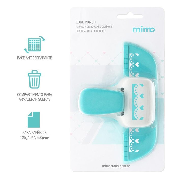 Furador de Borda de Papel MimoO Furador de Bordas Contínuas Mimo é fácil e rápido de usar para criar bordas decoradas de até 4,5 cm de largura no formato de corações. A base dessa ferramenta de corte é antiderrapante, o que dá mais precisão durante o uso, evitando que o cortador se movimente nesse processo de furação.Usando o gabarito impresso no produto, é possível decorar bordas contínuas de papéis de diversos tamanhos.Furador de Papel para Artesanato MimoCom esse furador de papel Mimo, você personaliza bordas contínuas de diversos tipos de artesanatos, como cartões, scrapfesta, envelopes, convites, peças de scrapbooking, encadernação, presentes, entre outros, por exemplo. O resultado é incrível, bem preciso e a furação é bem rápida e simples de fazer.O Furador de Bordas de Corações da Mimo é ideal para caprichar nos acabamentos de encomendas e essencial para enriquecer seus projetos de scrap.Informações Técnicas