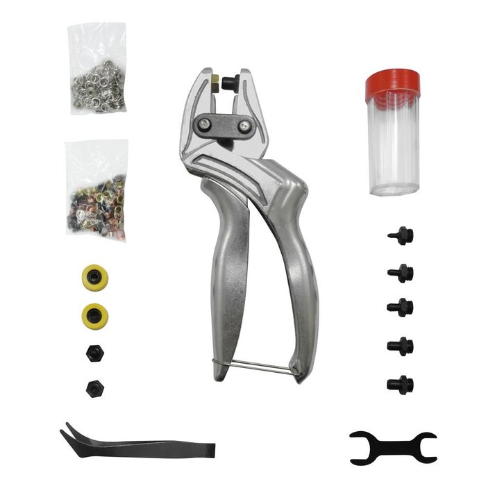 Alicate profissional vazador e fixador de ilhós, possui vários bicos de 1mm a 6mm. Indicado para couro, papel, cortiça, plástico, entre outros materiais.