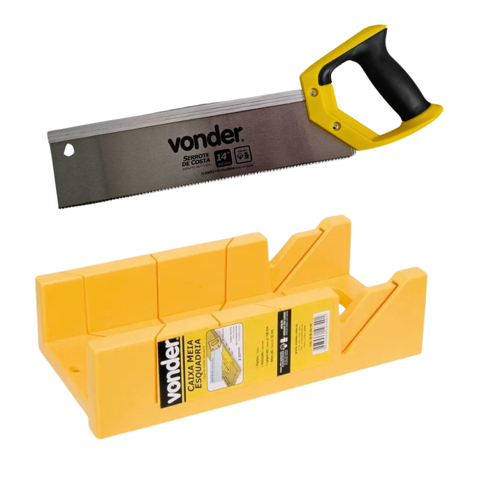 Kit Gabarito Caixa Meia Esquadria + Serrote Costa 12"Para corte de madeiras como molduras, forros, roda-forros, guarnições, PVC e acabamentos em geral. Indicado para uso em caixas meia esquadria, para cortes em grau, garantindo corte reto.Cabo em madeira envernizada e bainha de reforço na lâmina, para dar mais rigidez.Indicada para fazer cortes em ângulos de 45° e 90°.Produzida em plástico ABS, proporcionando maior durabilidade.Conteúdo da Embalagem:1 Serrote de costa1 Caixa de meia-esquadriaDescrição Técnica:Código: 30.71.000.700Modelo: Serrote de Costa 12” VONDERMaterial da Lâmina do Serrote: Aço TemperadoMaterial do Cabo do Serrote: MadeiraComprimento de corte do serrote: 12" - 300mmComprimento Total do Serrote: 390,0mmLargura da Lâmina do Serrote: 100,0mmNúmero de Dentes por Polegada: 9 dentesGarantia - E (CDC):Garantia legal: 90 diasPeso – 410gMaterial da caixa de meia-esquadria: PlásticoComprimento da caixa de meia-esquadria: 300mmLargura da caixa de meia-esquadria: 140mmAltura da caixa de meia-esquadria: 80mmLargura útil da caixa de meia-esquadria: 100mmAltura útil da caixa de meia-esquadria: 50mmGarantia - E (CDC):Garantia legal: 90 diasPeso – 350g