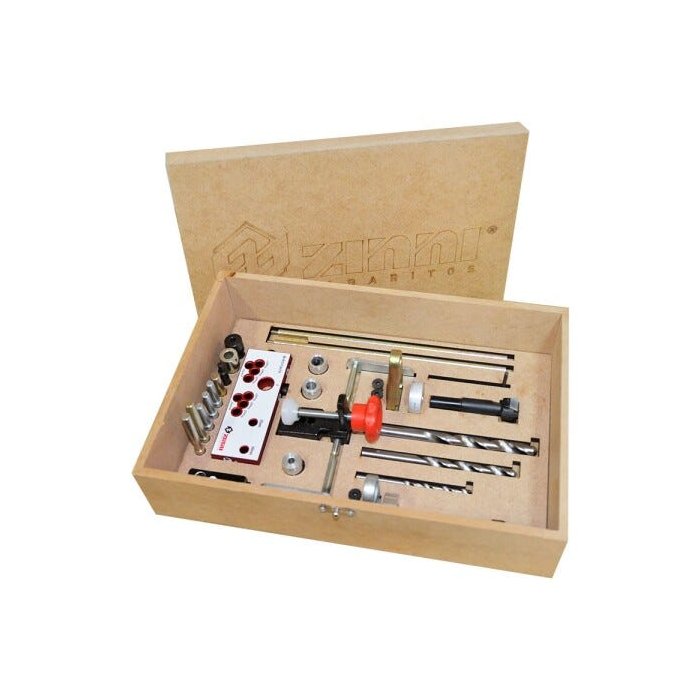 Kit Gabarito para Minifix e Rafix/Vb - Zinni Gabaritos/Aluzini Com o Combo Super da Zinni ficou muito mais fácil montar seus móveis utilizando Minifix e VB! Exclusivo Gabarito para aplicação de Minifix e VB vem acompanhando de Fresas, Brocas e Limitadores de Profundidade para que VOCÊ MESMO monte seus móveis com praticidade e precisão em chapas de MDF/MDP (15, 18 e 25mm), utilizando os principais dispositivos de montagem do tipo: Minifix/Tamborfix/Girofix (15mm), Rafix/VB simples e duplo (20mm) e Cavilha 8mm. Seu uso é ideal tanto para o profissional de Marcenaria, quanto para o “Hobbysta!”. Especificações: 01 Gabarito Grampo 02 Máscaras Intercambiáveis [15mm e 20/10mm] 01 Gabarito Bloco Flauta 01 Stoppers [2 furos] 02 Hastes [200mm] 02 Buchas de furação [5mm e 8mm] 02 Pinos montagem [5mm e 8mm] 05 Pinos para delimitar MDF/MDP [15mm, 18mm, 25mmm] 03 Brocas [5mm, 8mm e 10mm] 03 Limitadores de Brocas [5mm, 8mm e 10mm] 02 Fresas [15mm e 20mm] 02 Limitadores de Fresas [15mm e 20mm] 04 Parafusos allen para máscaras [M4 x 10mm, M4 x 12mm] 01 Chave Allen 01 Estojo/Maleta em madeira MDF Atenção: Este Kit não acompanha Adaptador para Bloco Flauta.