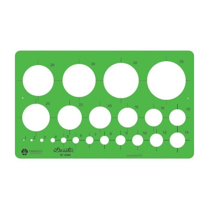 GABARITO CIRCULOS MM ? CICULÓGRAFO EM MILÍMETROS.Contendo 22 círculos, de 1 à 35 mm, com todos os raios para colocação fácil do centro.Produzidos em Astralon verde, na espessura de 0,75 mm. Com ressalto para traçado à tinta.Dimensão : 16,5 x 10 cm.
