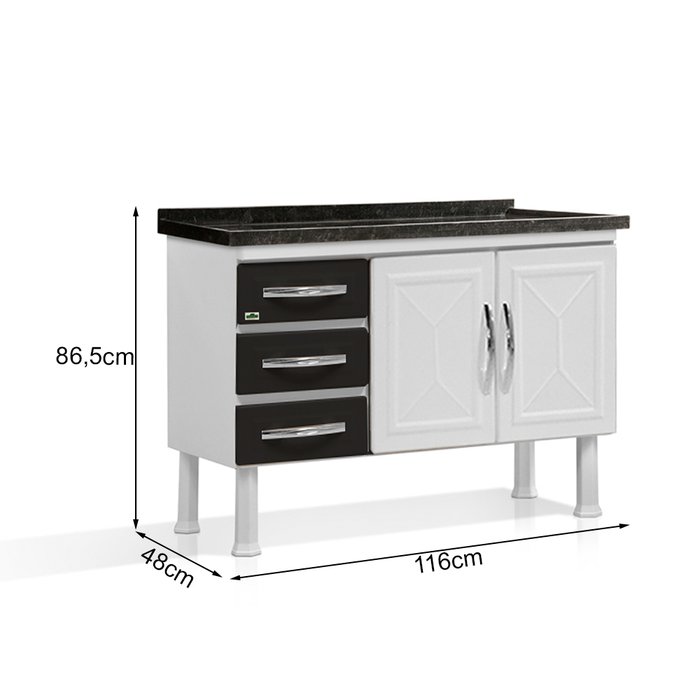 GABINETE ARMARIO DE COZINHA 100% AÇO PARA PIA 1.20 MT 2 PORTAS 3 GAVETAS BRANCO/PRETO -MARROART