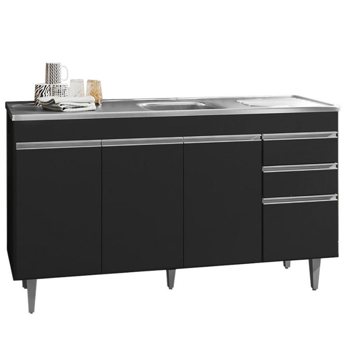 Gabinete Balcão Lena 1.50m 3 Portas 3 Gavetas S/ Tampo Cozinha Preto - Bela Móveis
