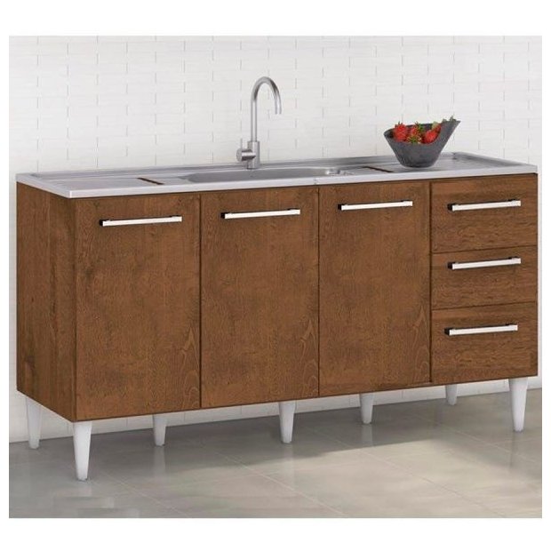 Balcão para pia 160 cm com 03 Portas e 03 Gavetas, estrututa e portas em Mdp de 15mm, pintura com acabamento Uv Castanho fosco. Composto por Portas de bater com dobradiças metálicas, gavetas com corrediças metálicas, prateleira interna, puxadores de plástico, pés de plástico com regulagem de altura. Este móvel chegará em sua casa separado em 01 Volume. DimensõesAltura 83 cm Largura 157 cm para pia de 160 cm Profundidade 50 cm Sistema De MontagemParafusos, Cavilhas. Recomendação de LimpezaLimpar com pano seco para retirar o pó. Não aplicar produtos abrasivos.Não Acompanha Tampo. Não Acompanha Cuba Para Pia.