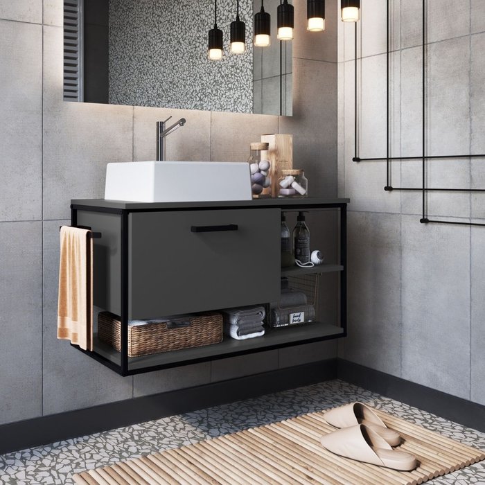 Gabinete Banheiro Armário com Cuba Pia Suspenso Porta Toalha Grafite com Preto