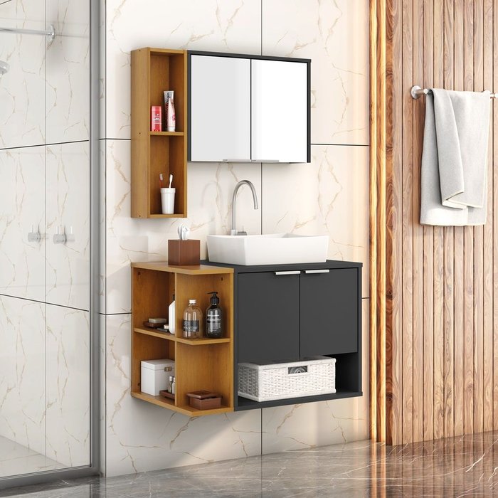 O Conjunto Para Banheiro Ibiza é ideal para sua casa! Com design inovador e funcional ele possui nichos laterais que irão acomodar perfeitamente utensílios essenciais para o seu banheiro! Ele é composto por cuba de mármore sintético em formato retangular. Gabinete com amplo nicho e 2 portas. Espelheira Superior com duas portas com espelhos com amplo espaço interno e nichos laterais. Nichos do gabinete e do espelho são versáteis e podem ser instalados tanto na direita quanto na esquerda do gabinete. Dobradiças metálicas e puxadores em alumínio anodizado.