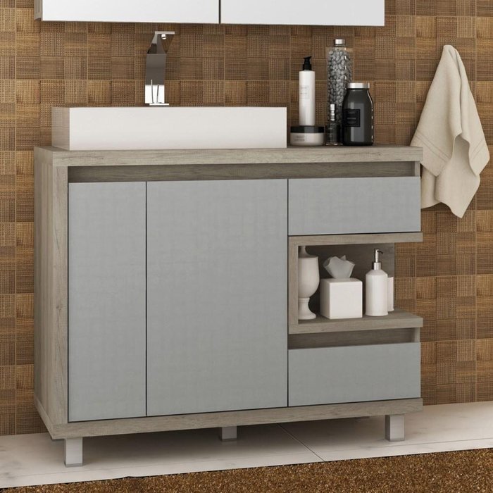 Gabinete Banheiro Suporte Secador 1 Porta 3 Gavetas Cinza Cinza