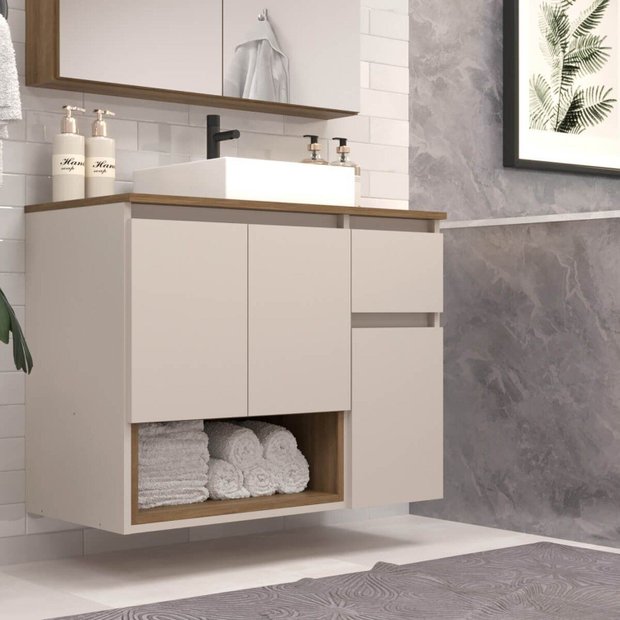 Gabinete Banheiro Suspenso 80cm com 03 Portas 01 Gaveta e Nicho com Cuba Aurora Mel/Arenas