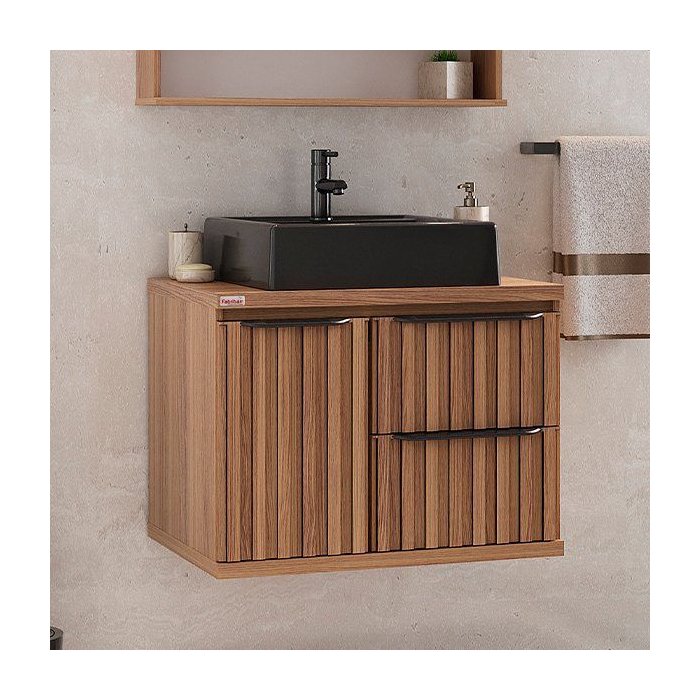 Esse detalhe da frente ripada faz do Gabinete Cecília uma peça especial, ideal para quem busca um banheiro com personalidade e design sofisticado.