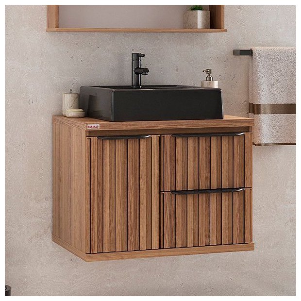 Esse detalhe da frente ripada faz do Gabinete Cecília uma peça especial, ideal para quem busca um banheiro com personalidade e design sofisticado.