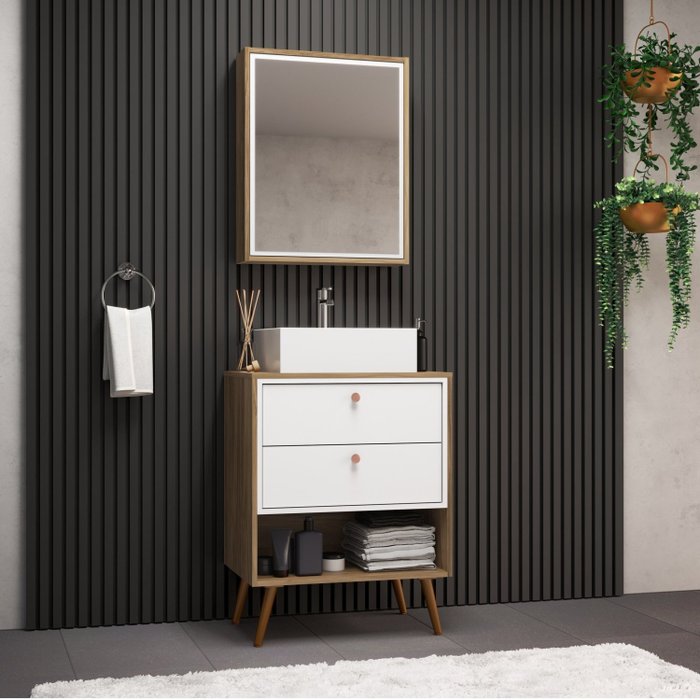 Gabinete com Pés para Banheiro 60cm com Cuba e Armário Gael Nogal/Branco