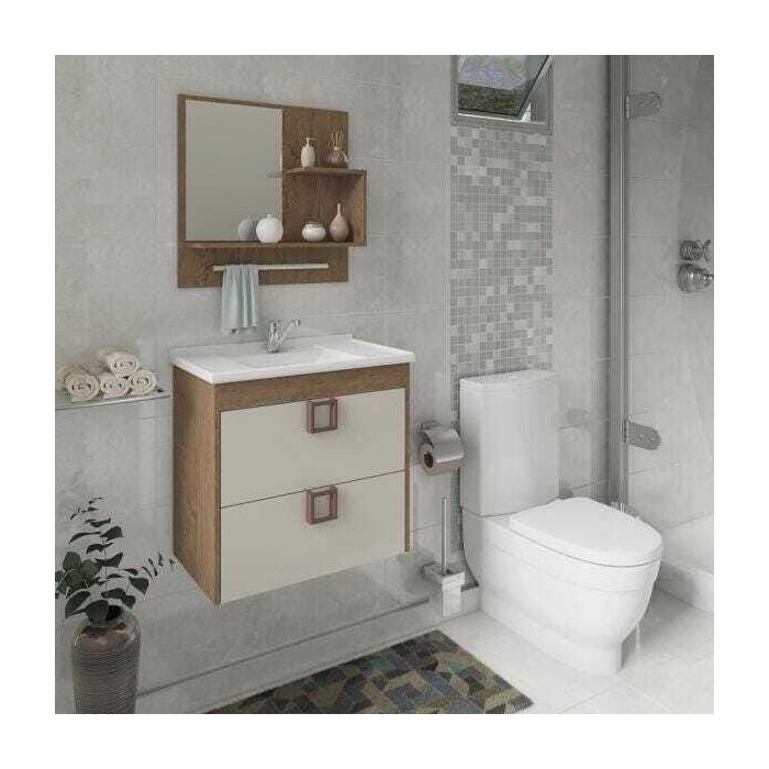 Gabinete De Banheiro 100% Mdf Lirio 59 Cm Com Espelho Amendoa/Off White - Mgm Armário para banheiro suspenso com espelheira, uma porta basculante e abertura com pistão à gás, uma gaveta com corrediça telescópica, espelheira com duas prateleiras e toalheiro em alumínio, puxadores em ABS, estrutura 100% MDF, amplo espaço interno, lavatório 100% mármore sintético com mais durabilidade e resistência. Não acompanha torneira. Dimensões do Produto: Altura: 56 cm Largura: 59 cm Profundidade: 35,5 cm