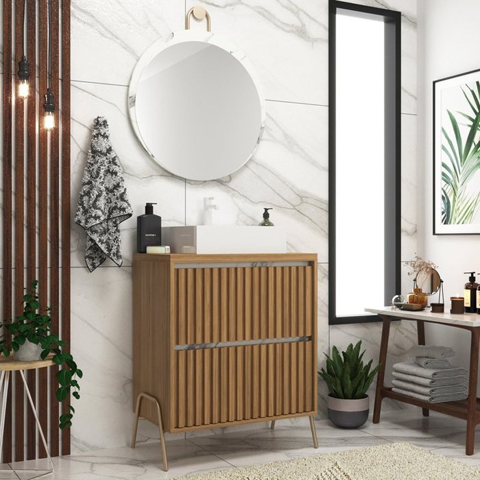 Com frentes de gaveta no estilo ripado moderno, este gabinete adiciona um toque contemporâneo ao seu banheiro.