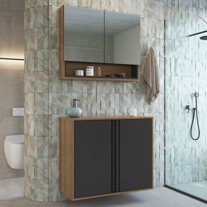 Gabinete de Banheiro 80cm com Espelheira 2 Portas sem Cuba Antônia Mel/Grafite