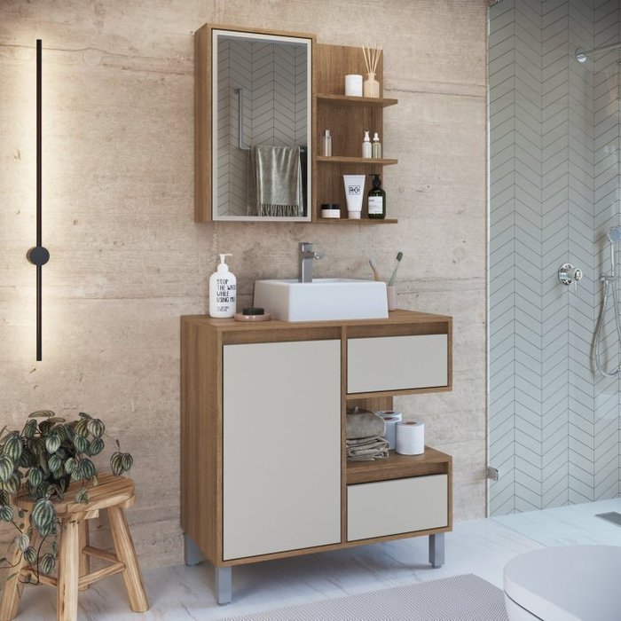 Gabinete de Banheiro 80cm Paula com Espelheira 01 Porta e Cuba Branca