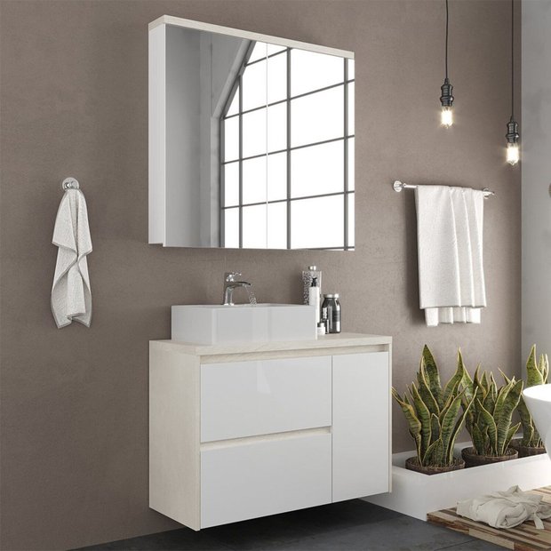 Gabinete de Banheiro 90cm com Cuba e Espelheira Arenito/Branco