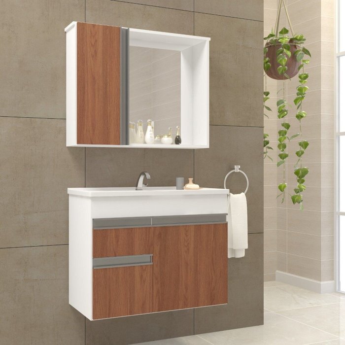 Gabinete para Banheiro suspenso , ele é composto pelo gabinete pia e espelheira , o gabinete possui uma porta, duas gavetas com corrediças telescópicas e um bom espaço interno tanto nas gavetas como no gabinete, e a espelheira contém um porta com uma prateleira de vidro para guardar pequenos produtos do dia a dia .