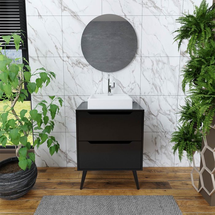 Gabinete de Banheiro Retrô com Pia e Espelho Redondo Preto Preto