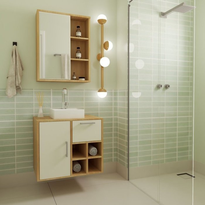 Gabinete de Banheiro Suspenso 68cm com Balcão 1 Porta 1 Gaveta e Espelheira sem Cuba