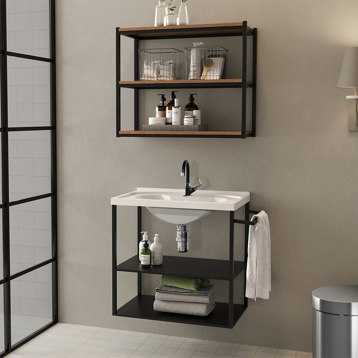 Gabinete Estilo Industrial Ipanema P/ Banheiro com Cuba 0,64m e Porta Toalha - Aço Preto Cuba Branca