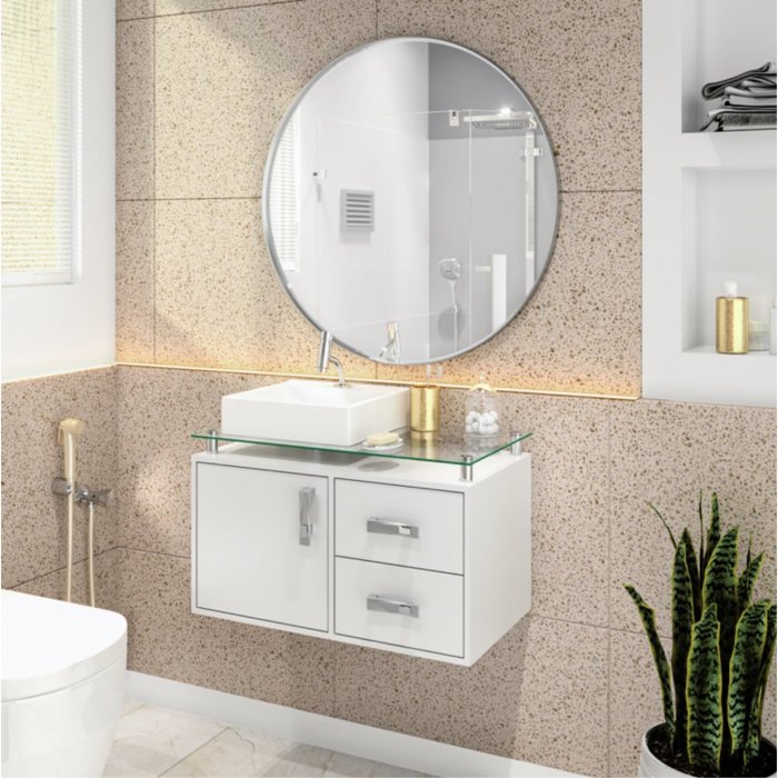 Gabinete para banheiro suspenso com cuba sobreposta em base de vidro temperado, uma porta, duas gavetas com corrediças telescópicas, puxadores em ABS, estrutura 100% MDF, amplo espaço interno, lavatório 100% mármore sintético com mais durabilidade e resistência.