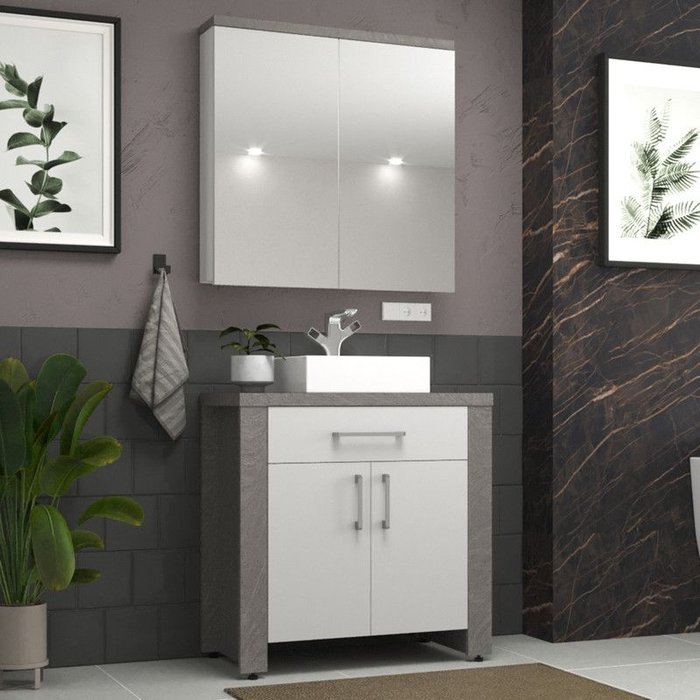 Gabinete para Banheiro 80cm com Cuba e Armário Ref 865 Cewal - Basalto/branco