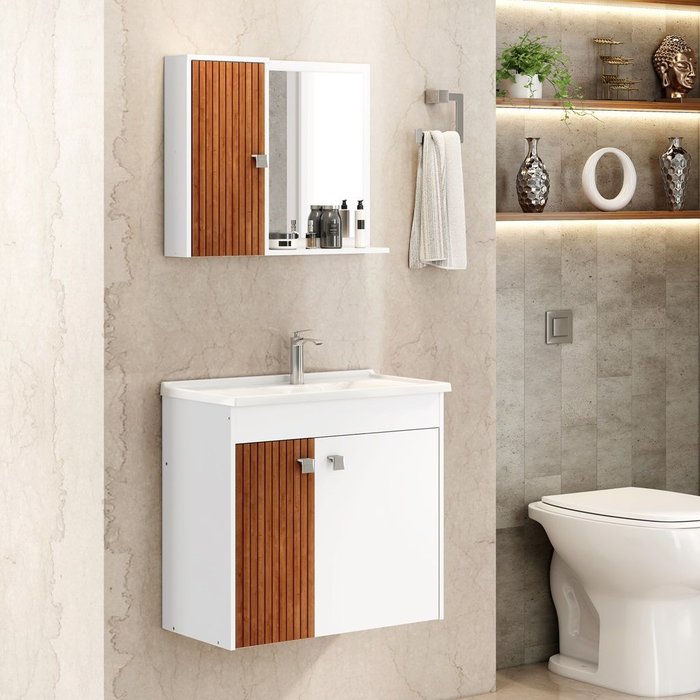 Conjunto para banheiro composto por cuba em mármore sintético, armário superior, espelheira e gabinete, elaborado em MDF com espessura de 12mm. Pintura da superfície em verniz poliéster semi-brilho, com secagem UV e impressão a laser, com acabamento com textura em alto relevo, destacando os veios da madeira com cores mais próximas às naturais. Possui puxadores de plástico com acabamento cromado e dobradiças metálicas. *Não acompanha torneira e acessórios. Porta com pintura 3D efeito ripado.