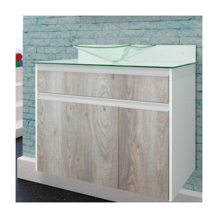Gabinete para Banheiro com Cuba e Tampo de Vidro 1 Porta 2 Gavetas Montreal Branco/Carvalho