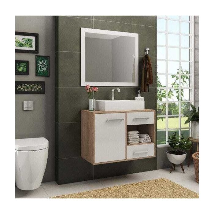 Gabinete para Banheiro Suspenso de 77cm de largura com nicho inferior, espelho e cuba. Possui porta de bater no balcão com dobradiças metálicas e duas gavetas com corrediças metálicas, além de puxadores cromados. Fabricado em MDP de 15mm, resistente a umidade.