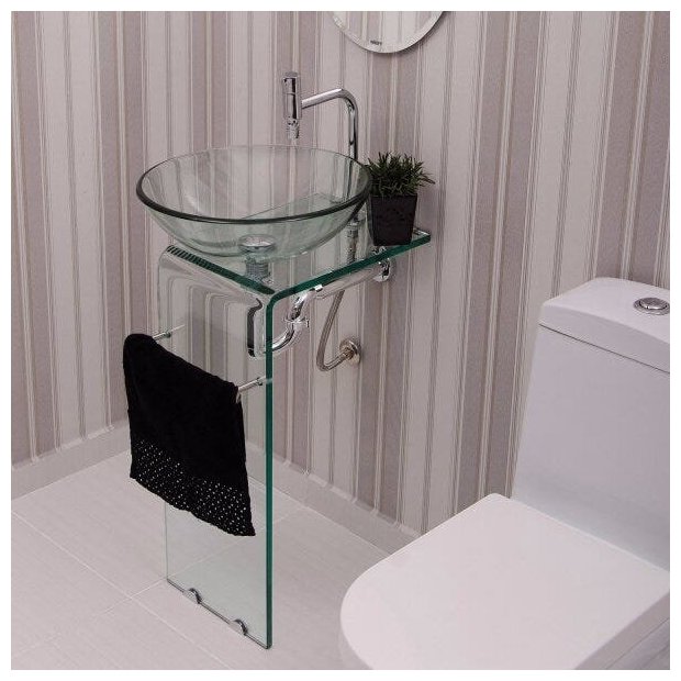 O uso de peças de vidros ajuda a criar uma sensação de leveza, valoriza o ambiente e ainda dá a sensação de que o ambiente é maior. Dispõem de suportes de fixação que permitem uma fácil instalação. Vidros e metais cromados também facilitam a limpeza e são mais resistentes a locais com umidade.