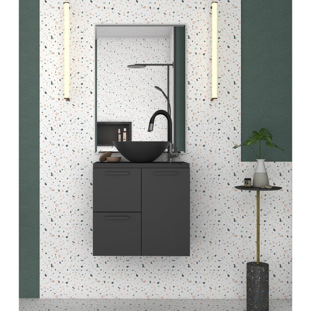 O Gabinete para banheiro em aço Osíris - Cozimax vai deixar seu banheiro com mais charme com o tampo granito, dobradiças com amortecimento, gavetas com corrediças telescópicas, puxadores de alumínio, prateleira interna e gavetas em aço.