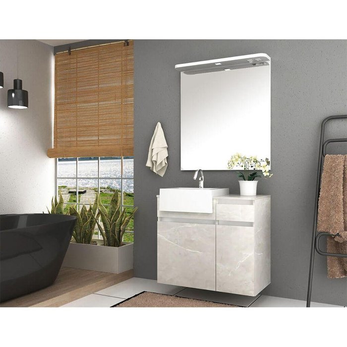 Gabinete para Banheiro Espelheira com Tomada e LED 80 cm Lilies Móveis Este conjunto é um modelo tradicional que nunca sai da moda e se adapta muito bem a qualquer ambiente. Oferece um design moderno e elegante. Acompanha balcão, cuba em mármore substânciado e espelheira.O balcão possui uma porta com prateleira interna e duas gavetas, sendo uma tulha ideal para acomodar as roupas sujas, contando com espaço suficiente para você guardar seus utensílios. E a espelheira possui luminária em LED 4x4 bivolt, bem como tecla e tomada, contém ainda os cantos arredondados no espelho, agregando sofisticação ao móvel.É um móvel que se ajusta a sua necessidade e gosto, pois, por ser suspenso, ele permite que você escolha a altura que vai ser instalado. Esta característica também evita que ele tenha contato direto com o chão, dando mais durabilidade ao móvel e facilitando a limpeza do banheiro.O material do conjunto é MDP e possui as dobradiças com a tecnologia slow-motion sendo o fechamento silencioso e com freio anti-impacto. Medidas LxAxP: 80x170x44 cm.Cor: Reale e Branco.Peso: 54,1kgEscala de Brilho: Semi-BrilhoEspessura do Espelho (mm): 3Espessura do Tampo (mm): 15Material da Estrutura: MDF/MDPMaterial do Tampo: MDPMedidas do Espelho ( A x L x P ) 86 x 79 x 0,3 cmMaterial das Corrediças: TelescópicaMaterial das Dobradiças: Caneco Com AmortecimentoMaterial do Puxador: Não PossuiPeso Suportado nas Gavetas (kg): 25Peso Suportado nas Prateleiras (kg): 8Quantidade de Prateleiras: 1Possui Espelho: SimPossui Vidro: NãoQuantidade de Gavetas: 2 GavetasQuantidade de Portas: 1 Porta Dicas de uso: Limpar com flanela ou pano macio seco, não utilizar produtos abrasivos, desengordurantes, álcool ou solvente. Não expor o produto diretamente à luz solar e à umidade. Não nos responsabilizamos pela montagem.As imagens são meramente ilustrativas. Objetos decorativos e eletrônicos não acompanham o produto.A tonalidade dos produtos pode variar de acordo com a luminosidade, monitor ou percepção visual.