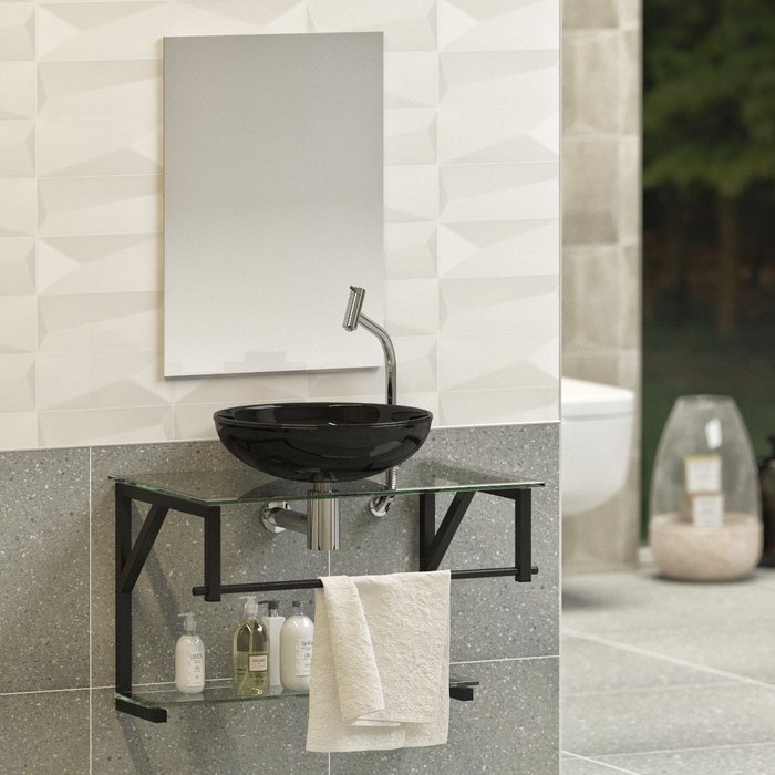 Kit Gabinete Banheiro Vidro Glass 60cm - (ferragem preta e cuba preta)