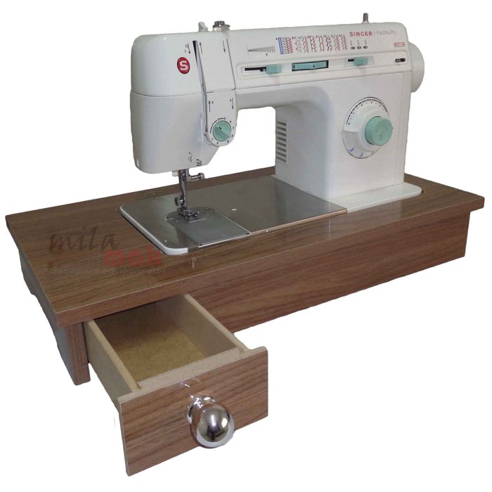 Gabinete de madeira portátil com gaveta para guardar acessórios e encaixe para sua máquina.