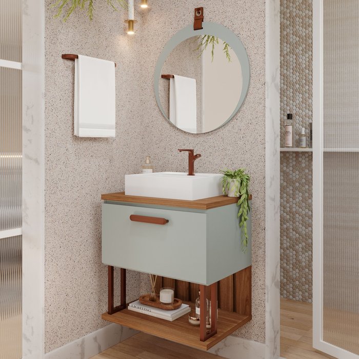 Gabinete Suspenso Banheiro Mari 60cm com Cuba e Espelheira Lua Espresso Móveis Pistache